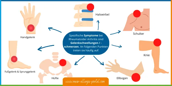 - Anhaltende Gelenkschmerzen, insbesondere in den Finger- und Zehengrundgelenken, aber auch Handgelenke, Füße, Ellbogen, Knie und Schultern können betroffen sein.