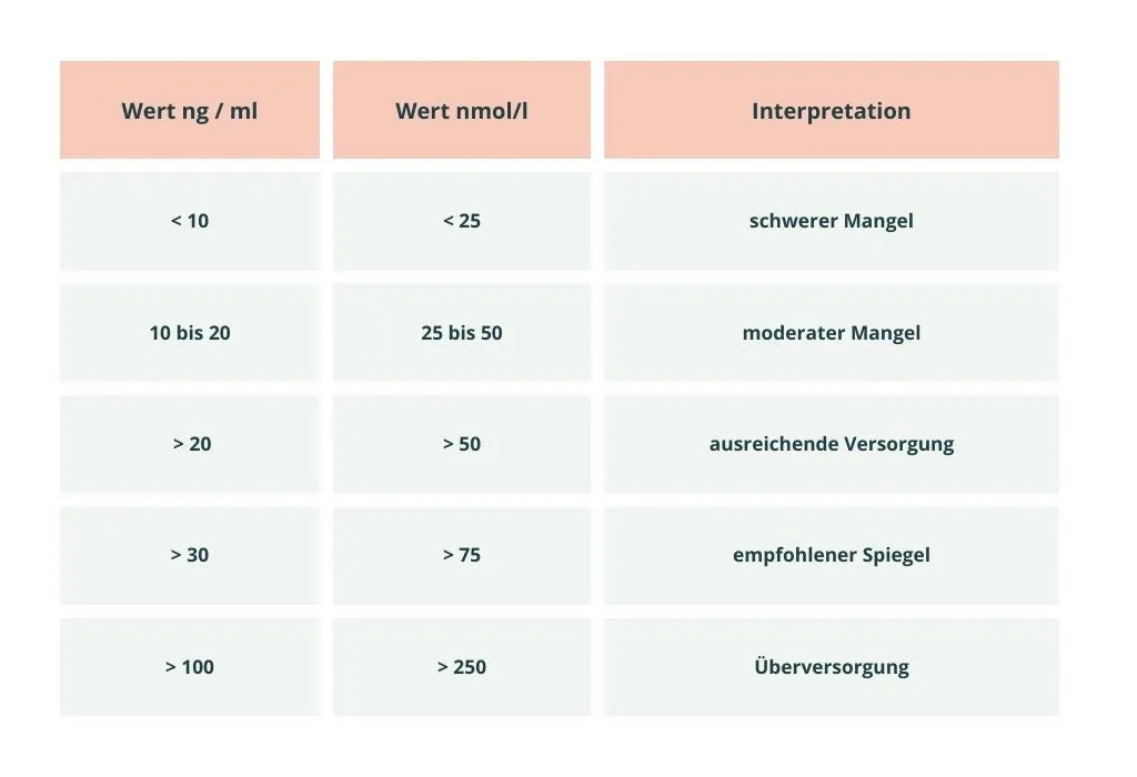 - Ausreichend: Werte zwischen 50 und 75 nmol/l (20 und 30 ng/ml)