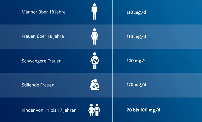 - Raucher, Schwangere und Stillende haben einen deutlich erhöhten Bedarf, z.B. Raucherinnen 135 mg, Raucher 155 mg.
